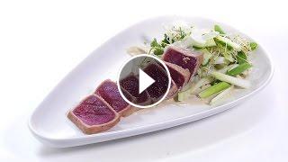 מתכון לסלט ירוק עם נתחי פורל מזוגגים בחרדל וליצוף